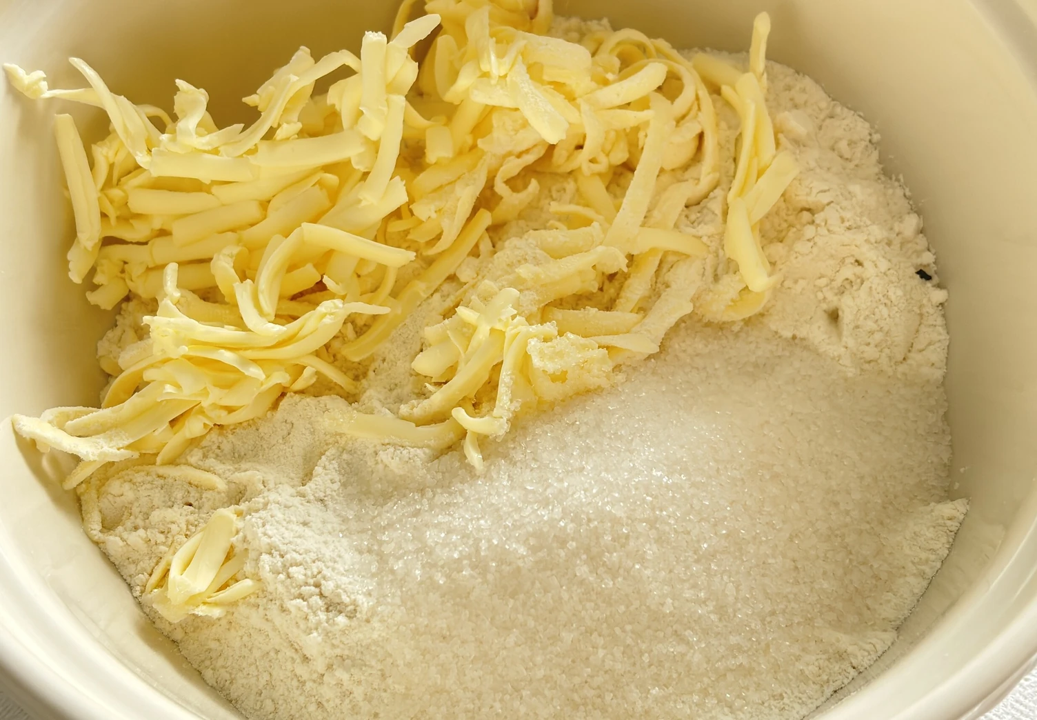 Для песочной основы натрите холодное сливочное масло на крупной тёрке. В миске перетрите натёртое масло с мукой и сахаром до состояния мелких крошек.