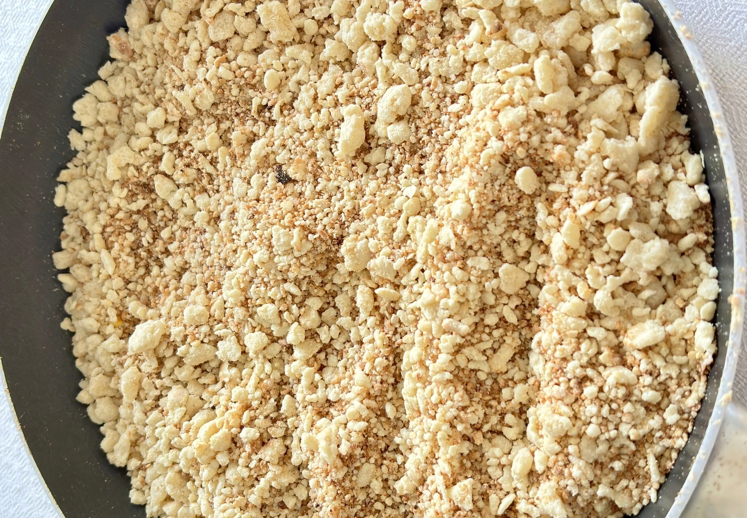 Выложите крошки на сковороду и жарьте до золотистого цвета. Снимите с огня и дайте полностью остыть.