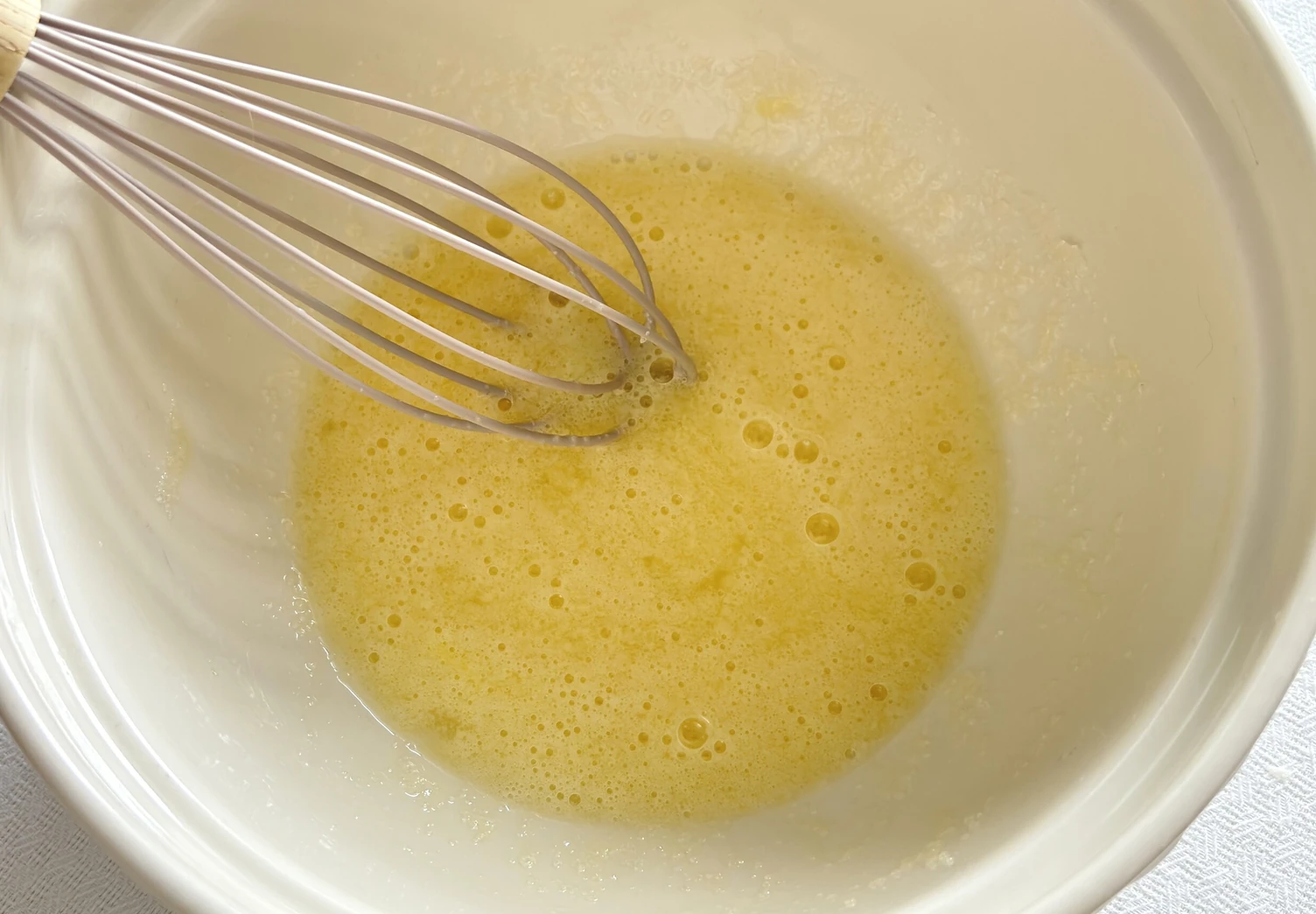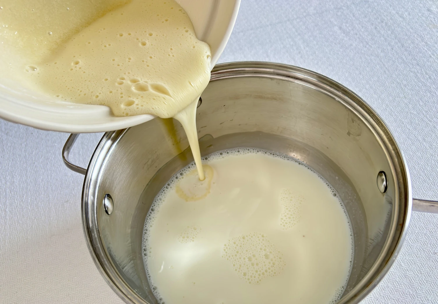 Добавьте в яичную смесь кукурузный крахмал, тщательно перемешайте и вылейте в тёплое молоко.