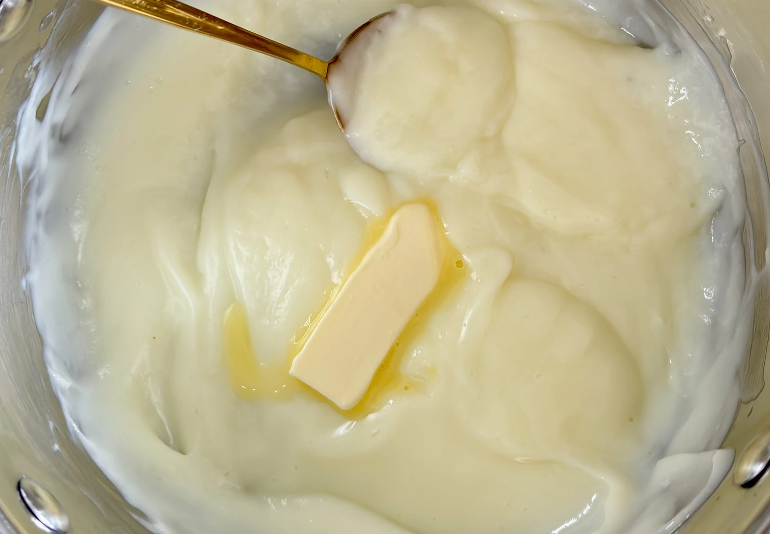 Снимите крем с огня и добавьте холодное сливочное масло. Перемешайте и дайте полностью остыть.