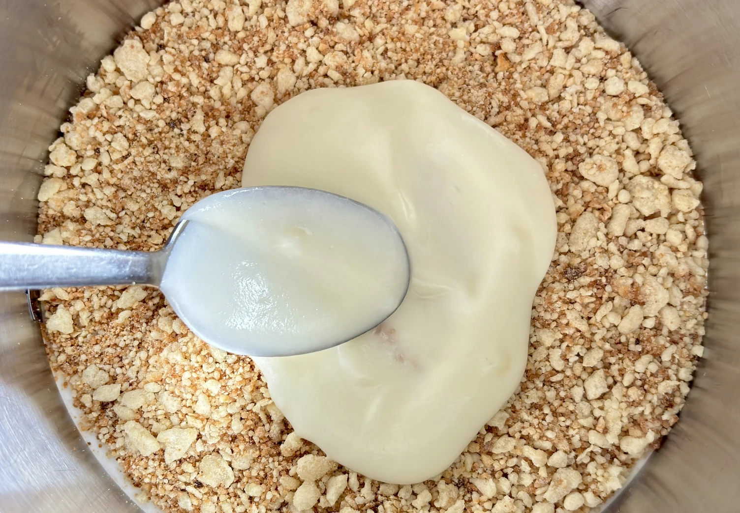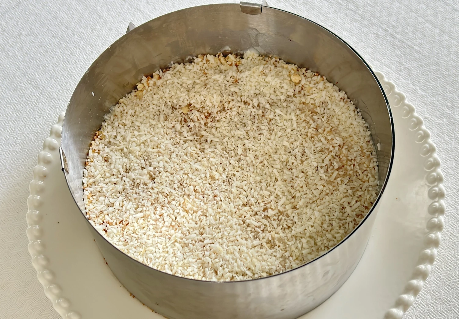 Собирайте торт в кольце диаметром 18 см, чередуя слои крошки и крема. Сверху можно украсить торт кокосовой стружкой.