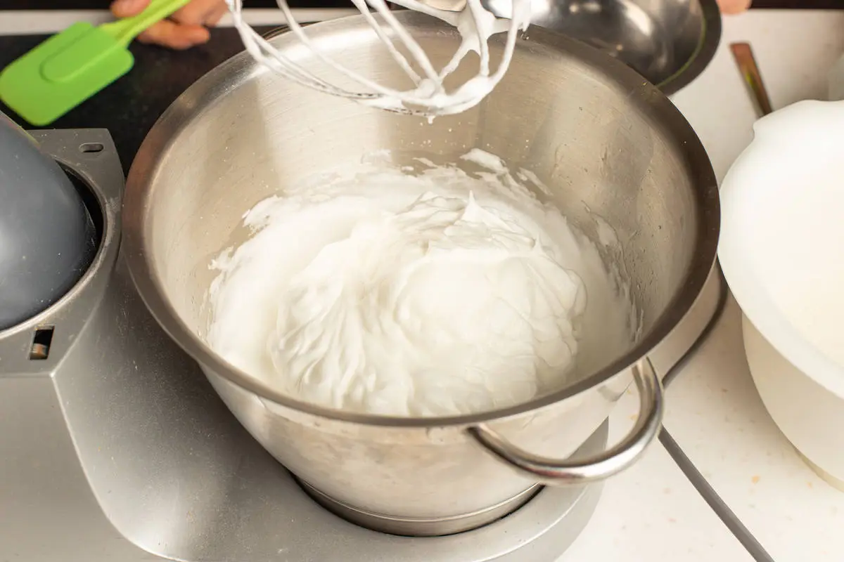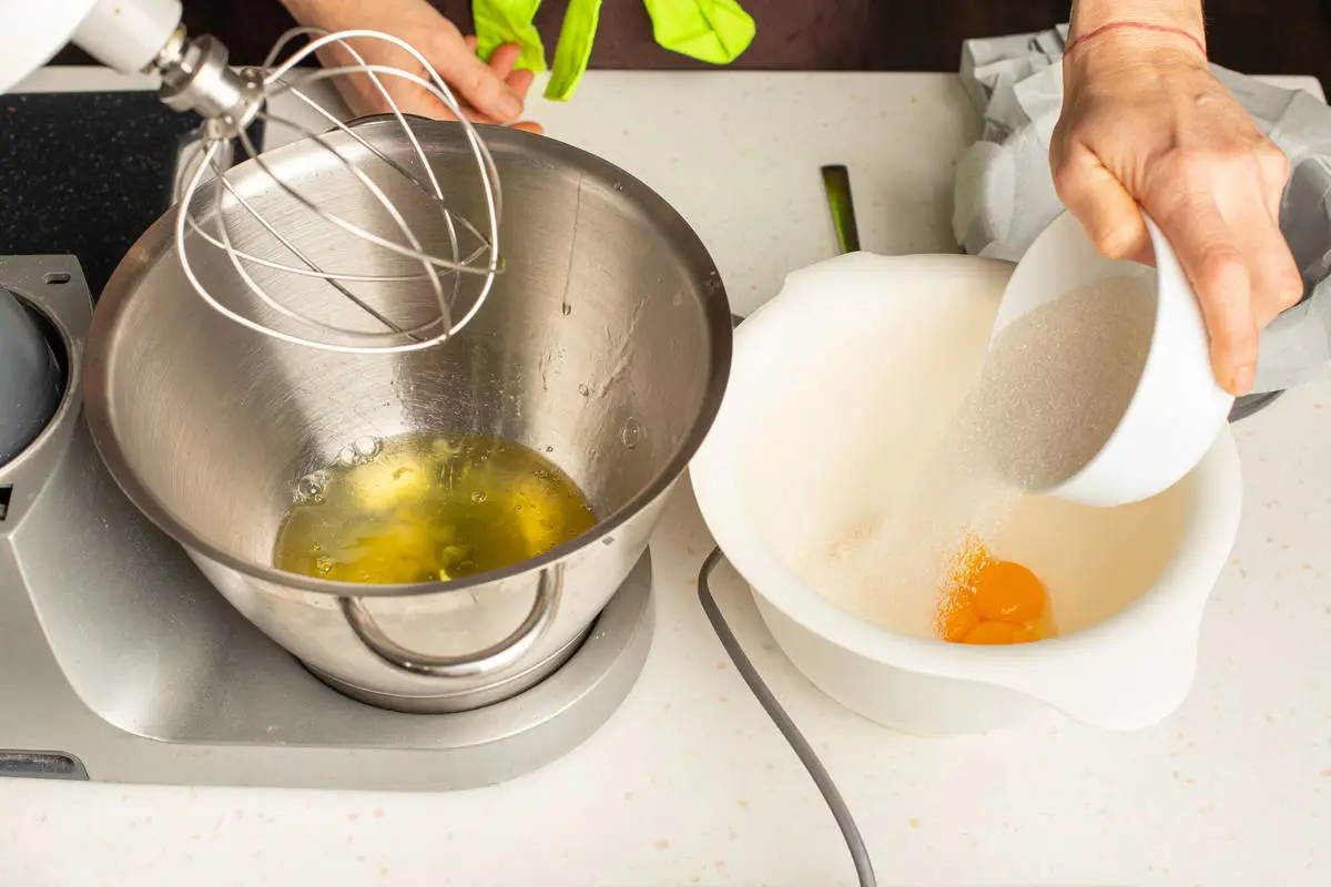 Белки взбейте до мягких пиков, добавьте около 50 г сахара и взбейте ещё до плотности. Желтки взбейте с оставшимся сахаром (100 г) в отдельной ёмкости в пышный крем до полного растворения сахара.