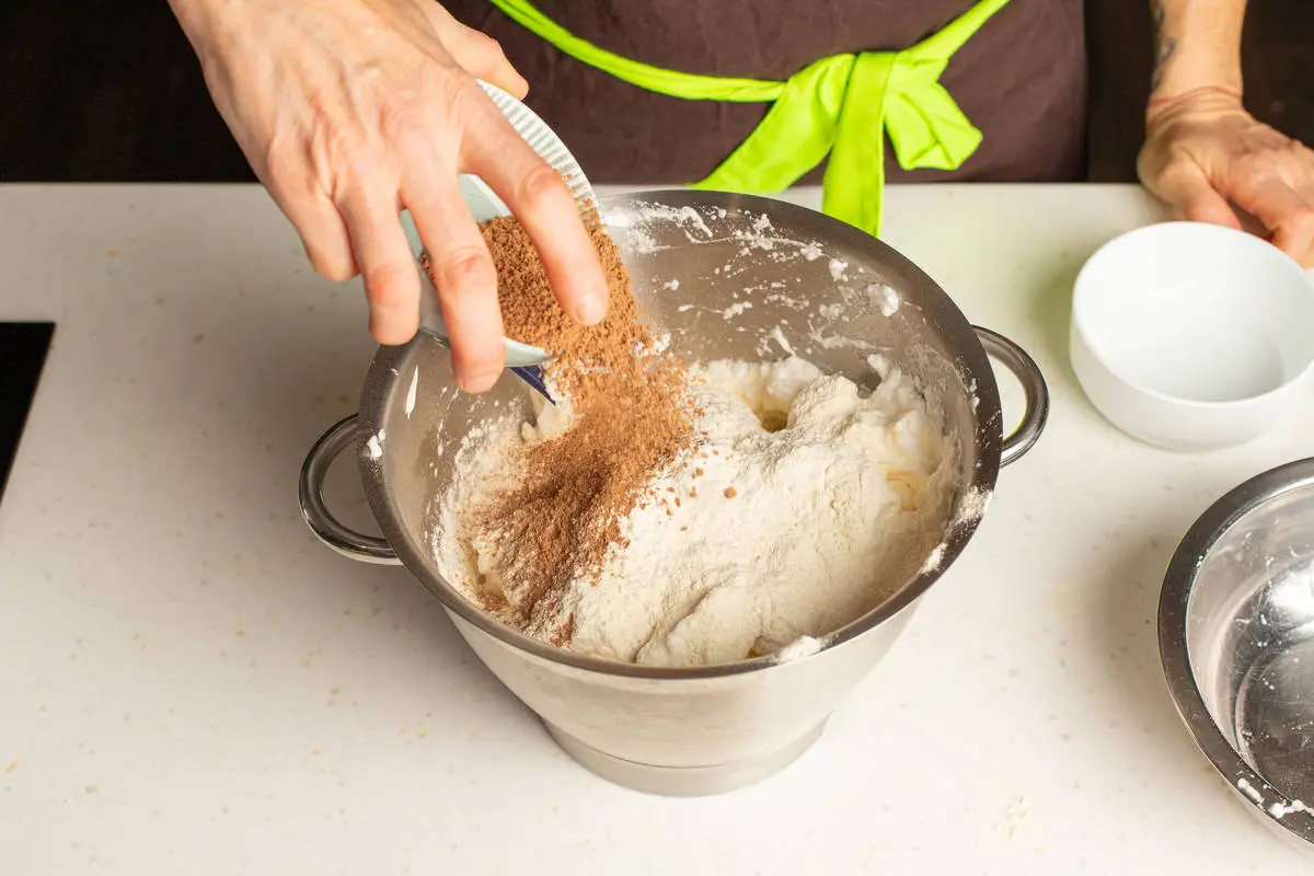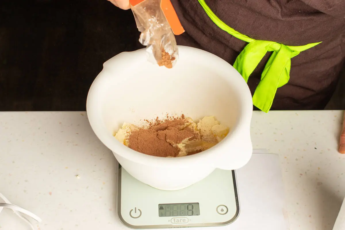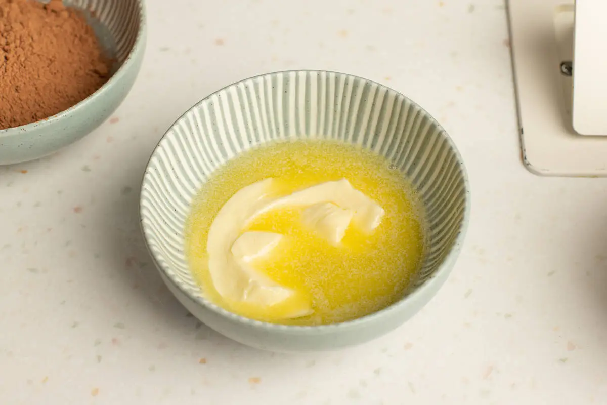 Аккуратно смешайте желтки с белками, добавьте просеянную муку и какао. Добавьте растопленное и остывшее до примерно 30 °C масло, аккуратно перемешайте.