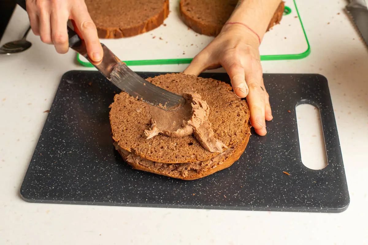 Корж разрежьте вдоль на 3 части. Намажьте каждую кремом и соберите торт.