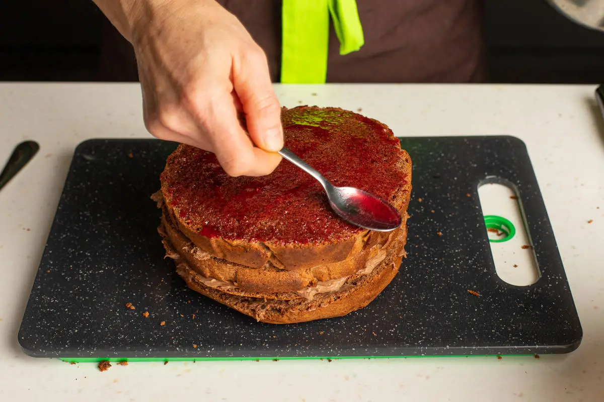 Верхний корж смажьте джемом. Оставшимся кремом смажьте боковины торта.