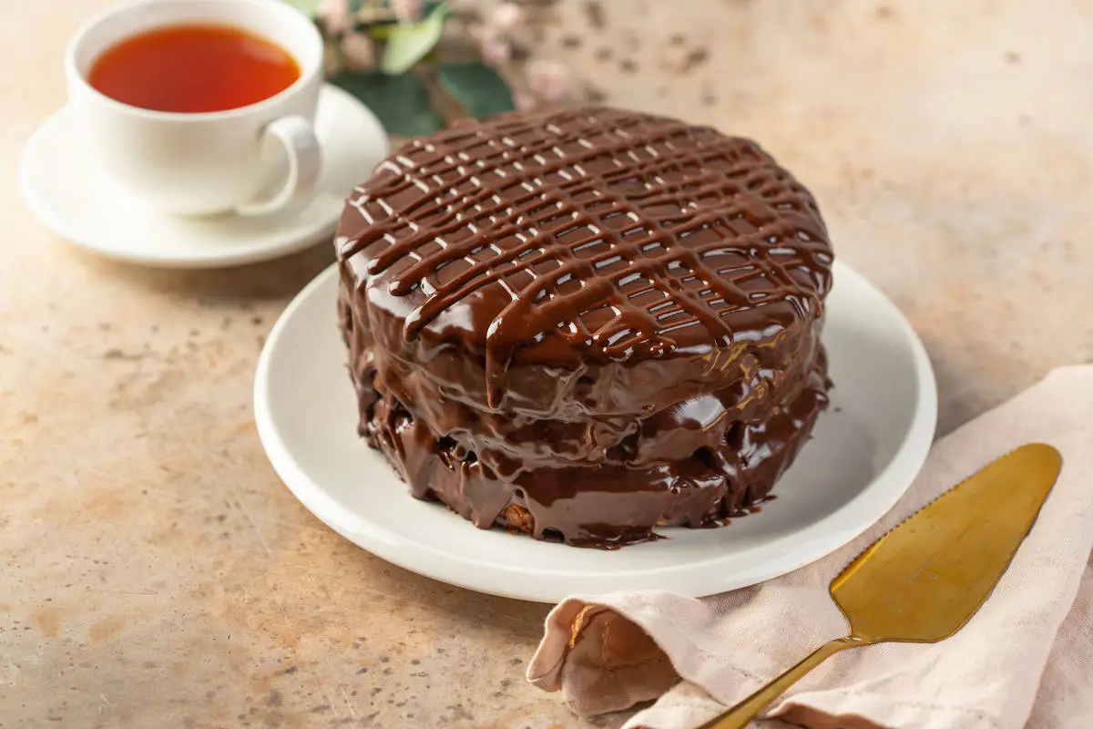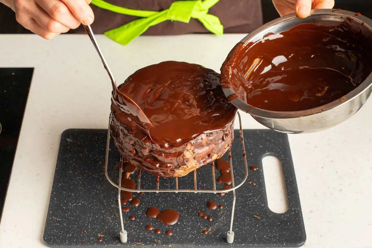 Растопите шоколад со сливочным маслом, получившейся глазурью залейте торт. Дайте «Праге» настояться 1-2 часа в холодильнике.
