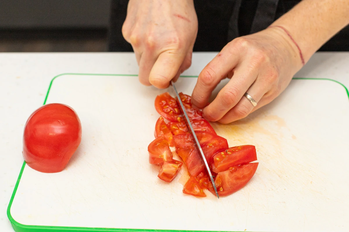 Томаты нарежьте кубиками, у чеснока удалите зелёные сердцевинки, измельчите.