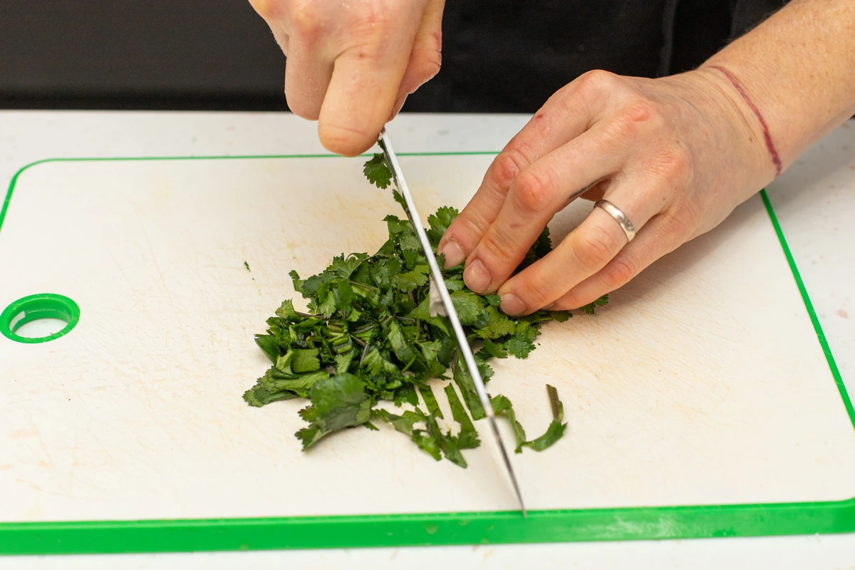 Отрежьте несколько колечек острого перца. Кинзу измельчите.