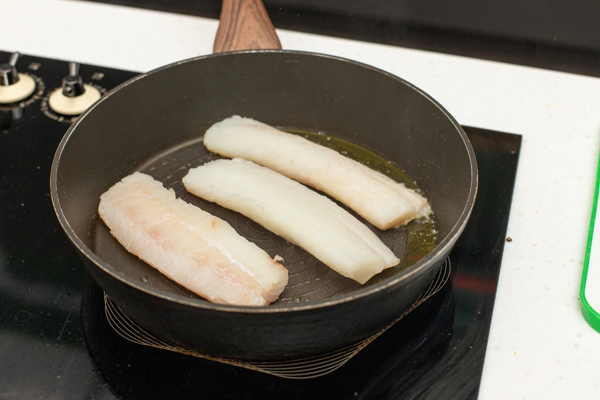 В сковороде быстро обжарьте треску на оливковом масле до золотистости, примерно по 1 минуте с каждой стороны. Уберите треску со сковороды.