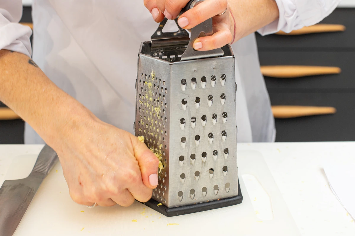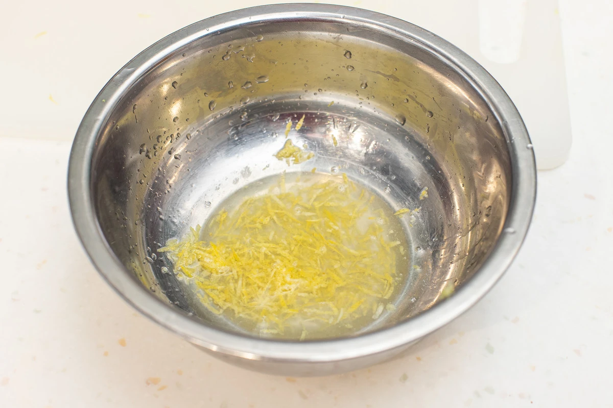 С лимона снимите цедру с помощью тёрки или специального ножа. Выжмите сок из половины лимона. Смешайте в мисочке сок с цедрой.