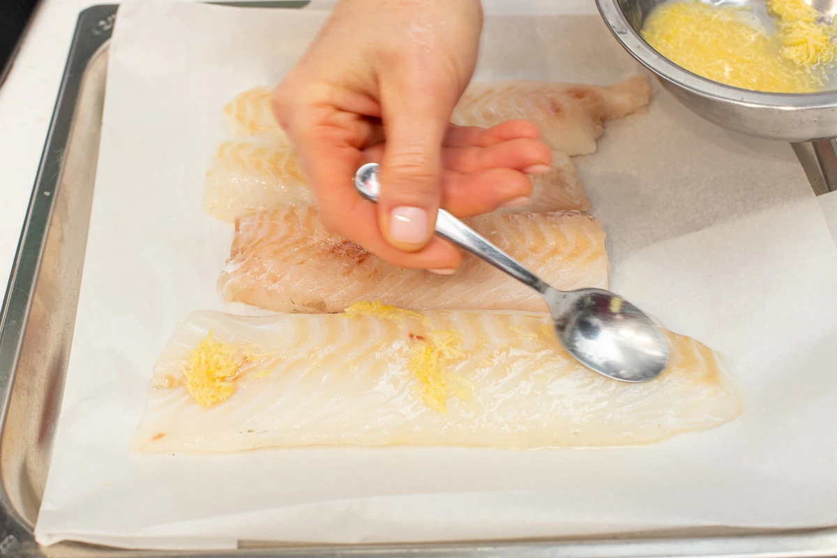 Застелите противень пергаментом. Выложите рыбу на противень, равномерно распределите по филе лимонно-имбирную смесь. Оставьте мариноваться на 15 минут. Запекайте треску в течение 20-30 минут (до готовности) при 180 °C.