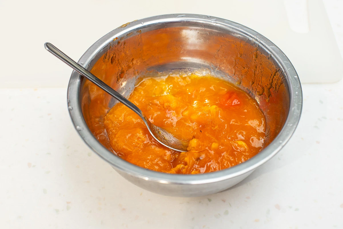 Сделайте соус. Если у вас очень спелая хурма, выложите мякоть без кожи ложкой в мисочку. Если фрукт достаточно твёрдый, нарежьте его кубиками. Выжмите сок из оставшейся половины лимона и добавьте в хурму. Посолите, поперчите, перемешайте.