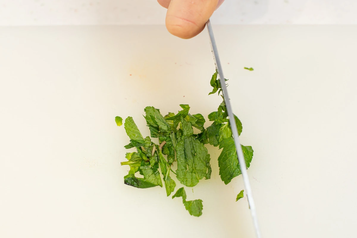 Лук и мяту мелко нарежьте и добавьте к хурме, перемешайте.