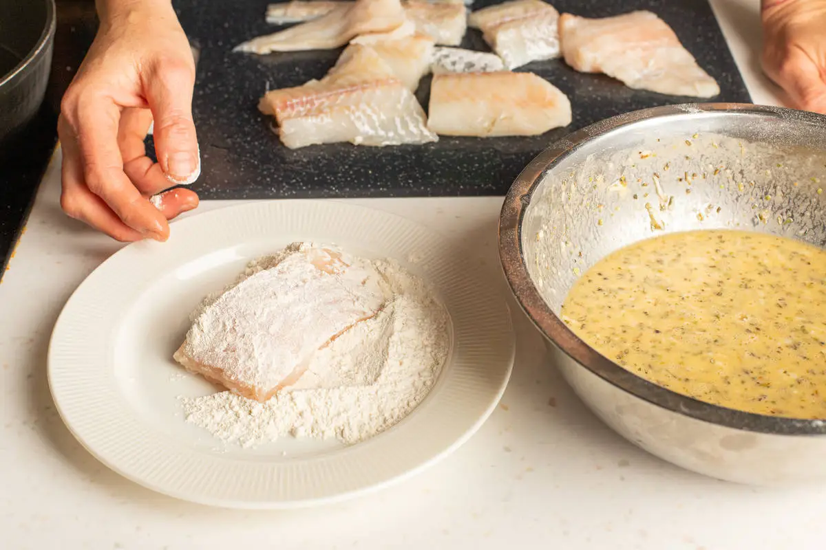 Куски рыбы обваляйте в муке, затем обмакните в кляр и жарьте на растительном масле по 6-8 минут с каждой стороны на среднем огне.