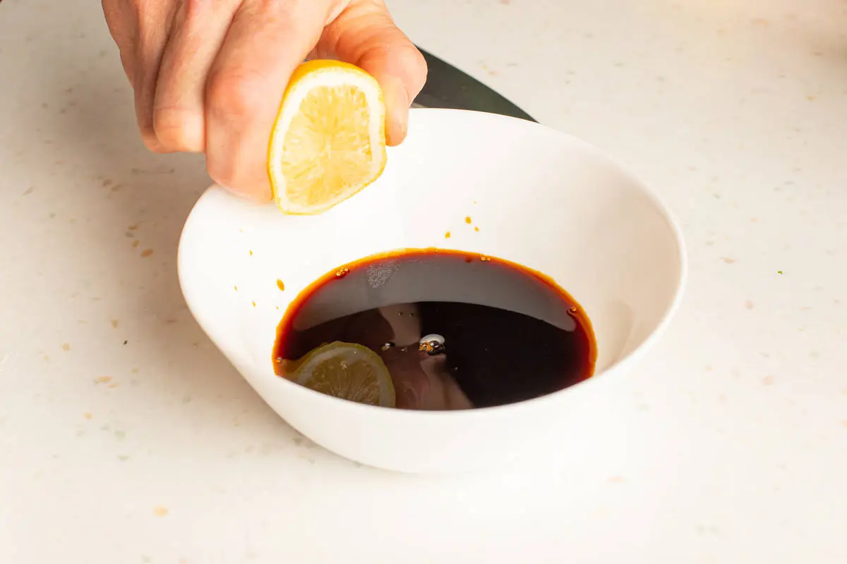 Приготовьте соус, смешав соевый соус и лимонный сок.