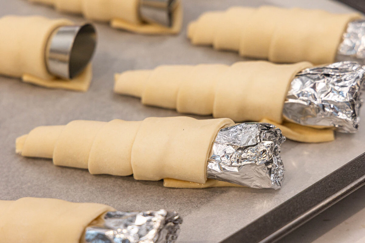 Из плотной фольги сделайте конусообразные формы диаметром около 4 см. Накрутите полоски теста на конус, чтобы получилась спиральная трубочка.