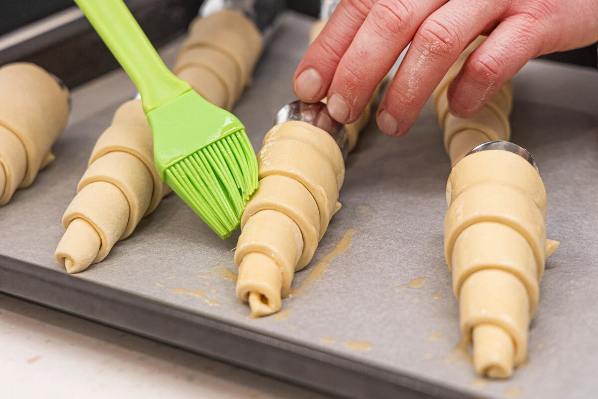 Яйцо слегка взбейте венчиком или вилкой, смажьте им место склейки полосок теста, а также поверхность трубочек.