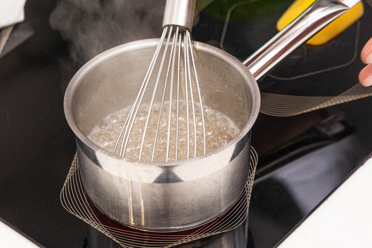 Смешайте в сотейнике сахар обоих видов, лимонную кислоту и воду. Доведите до кипения и варите на среднем огне около 5 минут, пока температура сиропа не достигнет 119 °C.