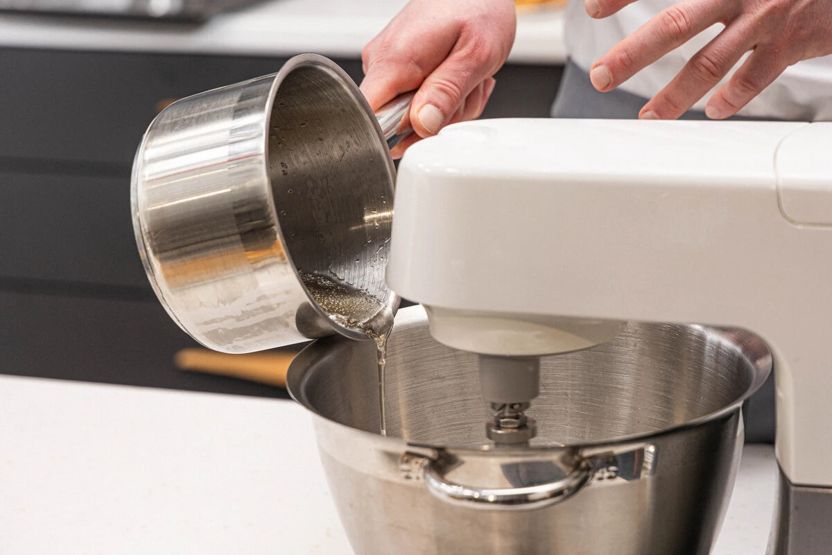 Влейте тонкой струйкой горячий сироп в белки, не переставая взбивать.