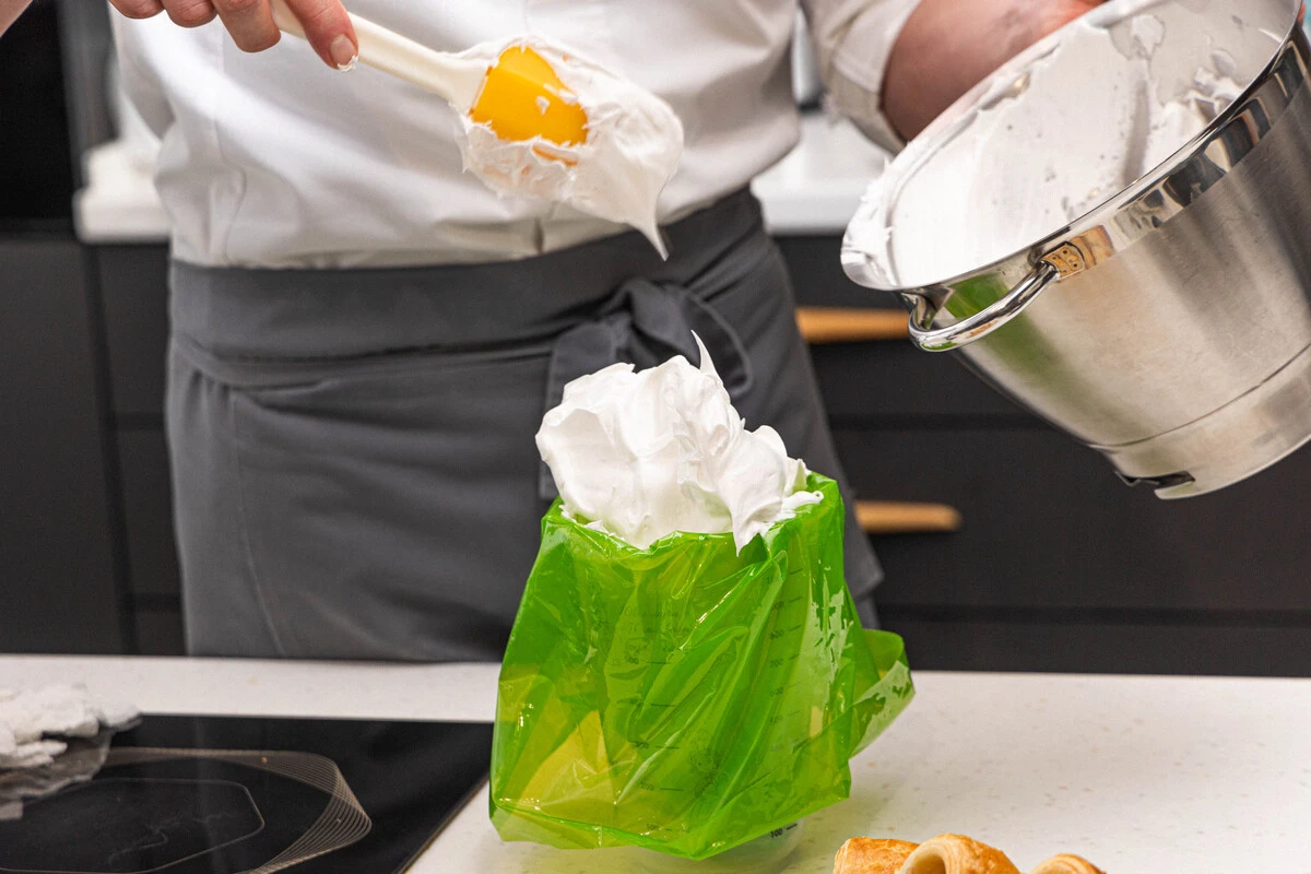 Продолжайте взбивать крем ещё 4–5 минут, пока белки не будут уверенно держаться на венчике. Переложите готовую массу в кондитерский мешок с фигурной насадкой.