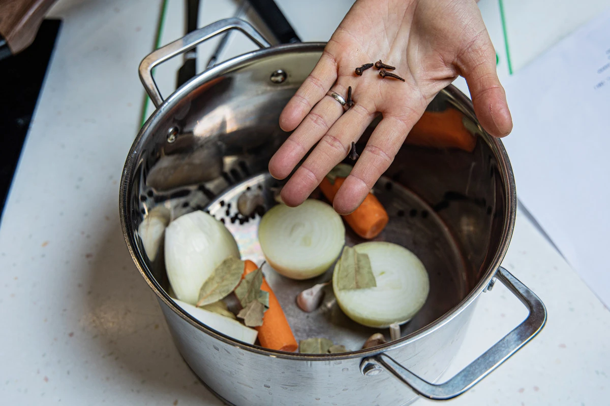 Очистите репчатый лук и одну морковь, крупно нарежьте. Лук-порей также разрежьте на крупные части. Головку чеснока очистите от верхнего слоя шелухи, разрежьте пополам поперёк зубчиков. Сложите всё в большую кастрюлю, добавьте горошины перца, гвоздику и лавровый лист.
