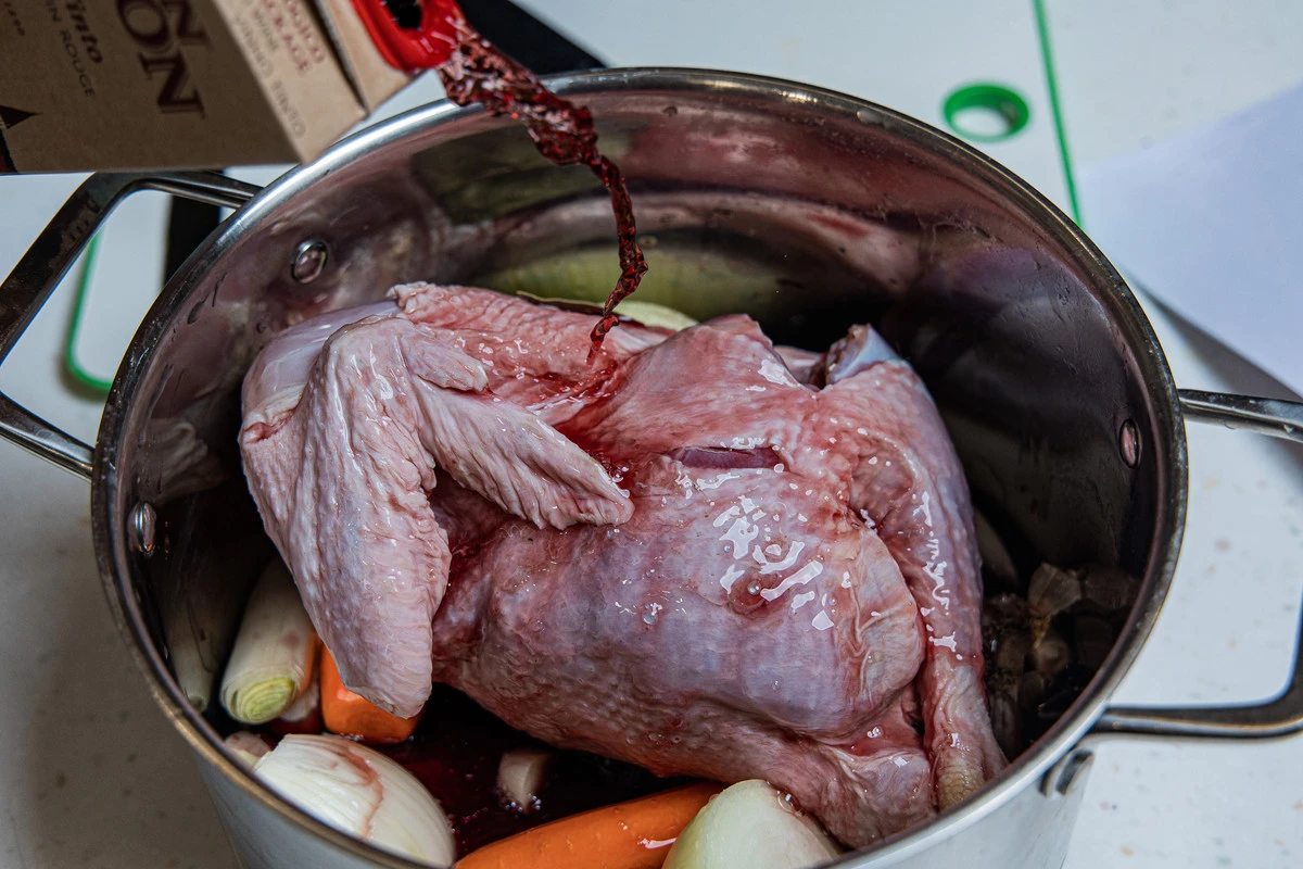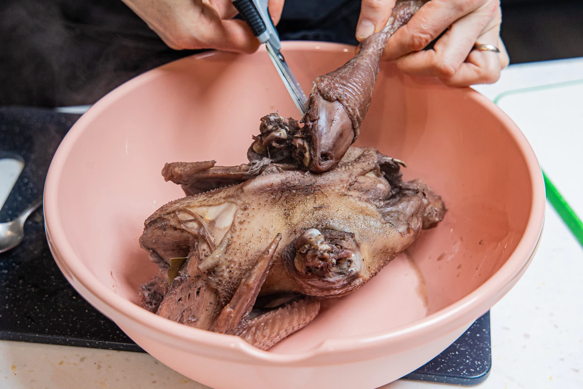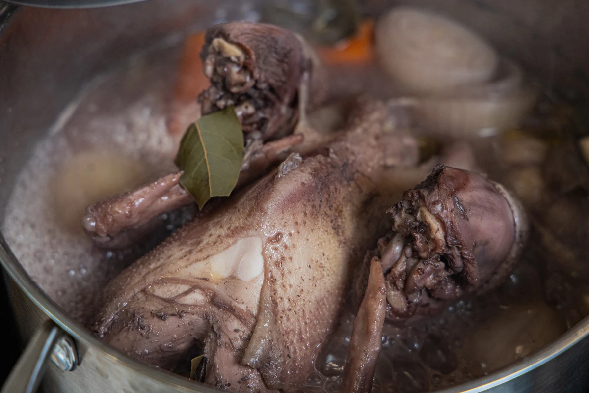 Поставьте кастрюлю на огонь, долейте воды столько, чтобы полностью покрыть птицу. Добавьте соль, доведите до кипения, убавьте огонь и варите около двух часов на медленном огне. Если вы готовите обычного бройлера, сократите время варки до 50 минут.