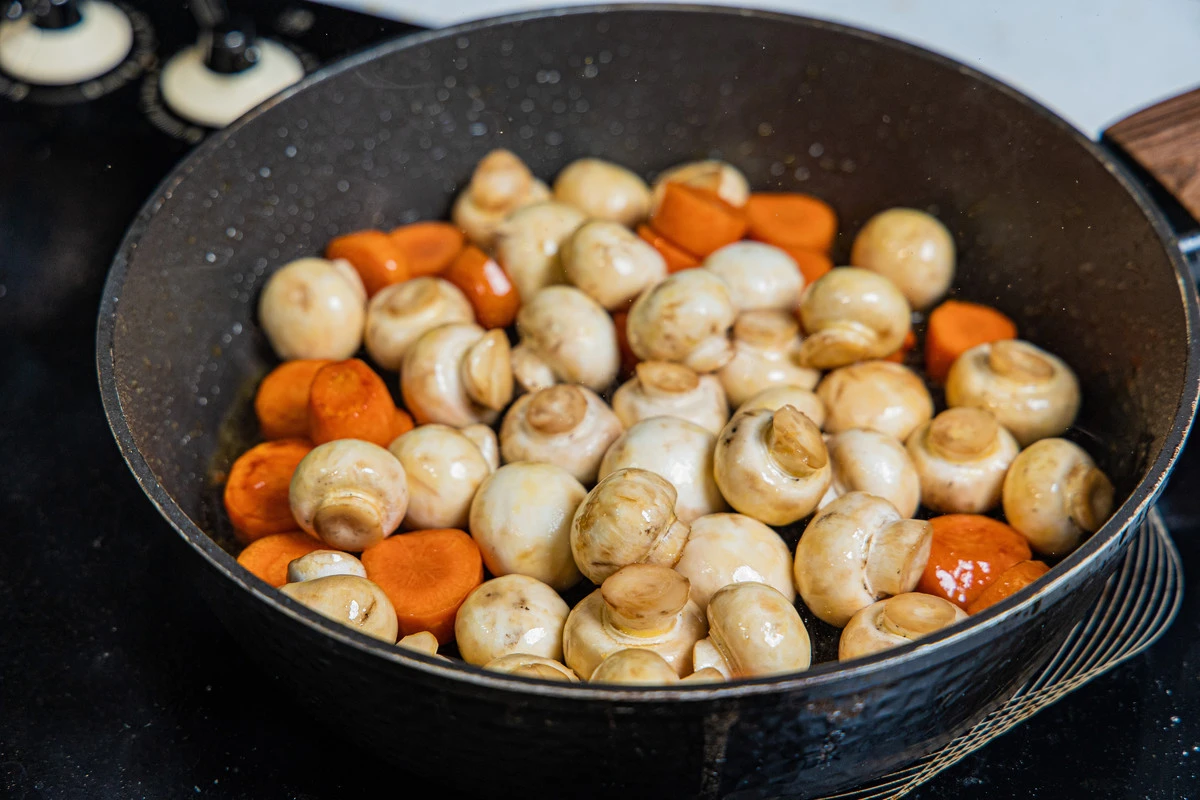 Оставшуюся морковь очистите, нарежьте толстыми кружочками. Шампиньоны почистите, если нужно, крупные нарежьте, а мелкие оставьте целыми. В сковороде растопите сливочное масло с добавлением чайной ложки оливкового, добавьте сахар и карамелизуйте морковь около 5-7 минут. Добавьте шампиньоны, немного воды и тушите под крышкой около 5 минут.