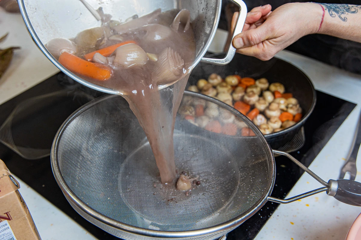 Бульон процедите, сварившиеся овощи уберите, они нам не понадобятся.