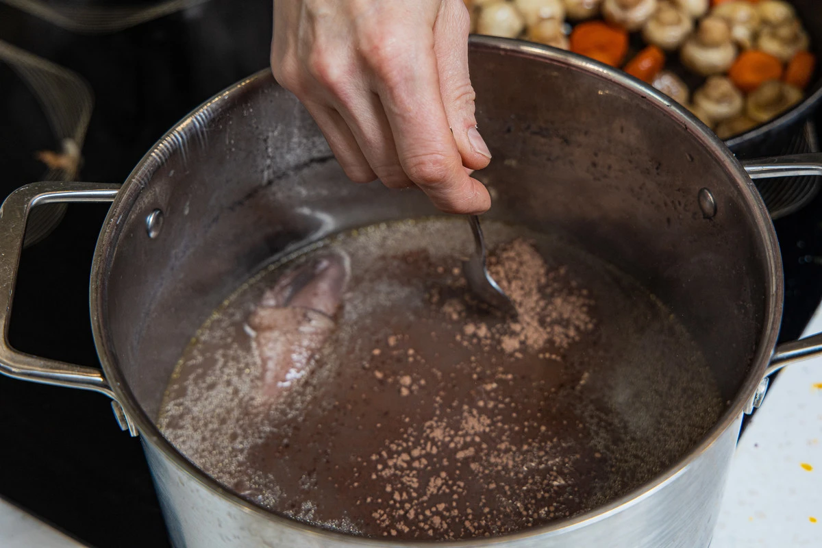 В бульон добавьте чайную ложку какао и тимьян, размешайте и проварите при слабом кипении 5 минут.