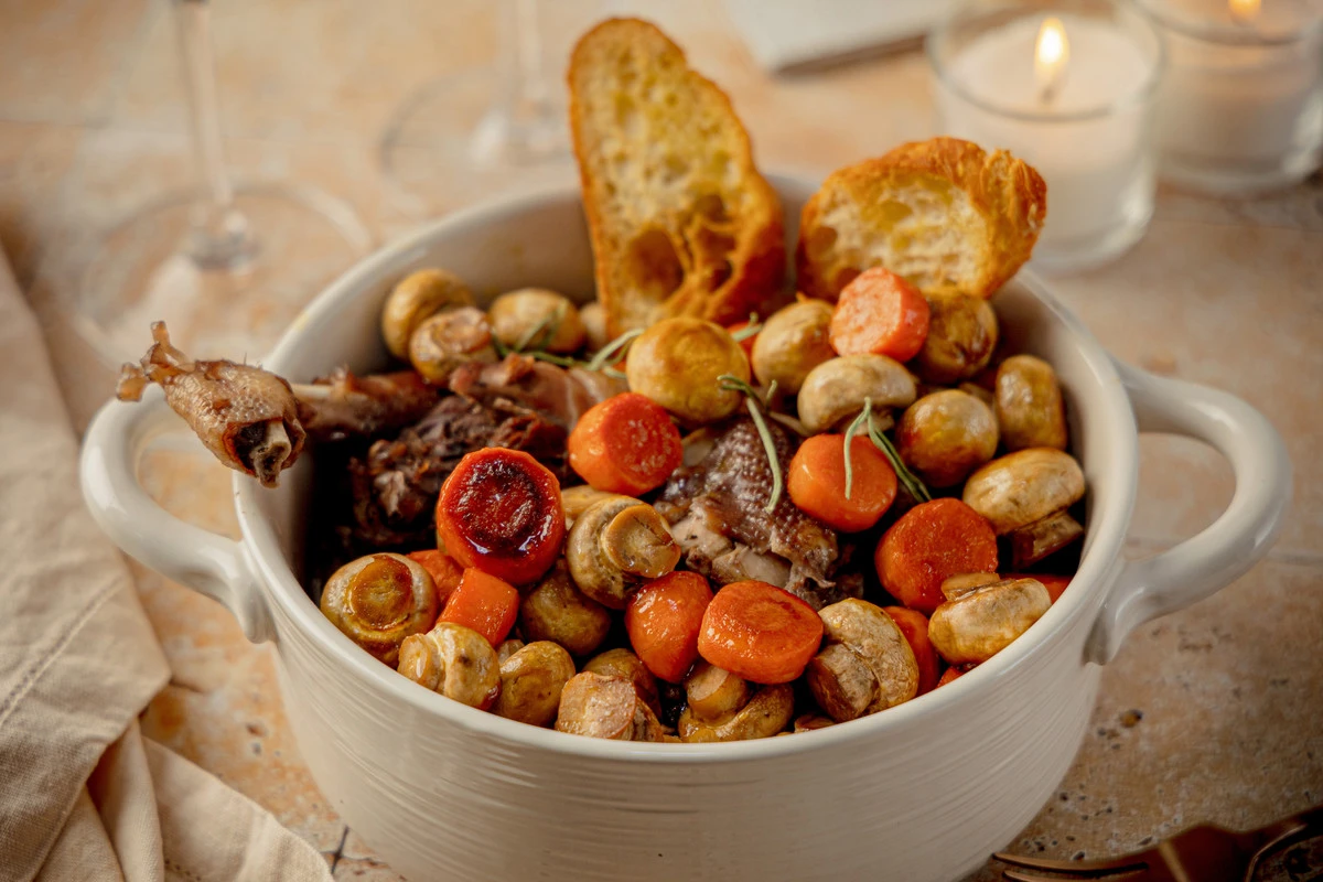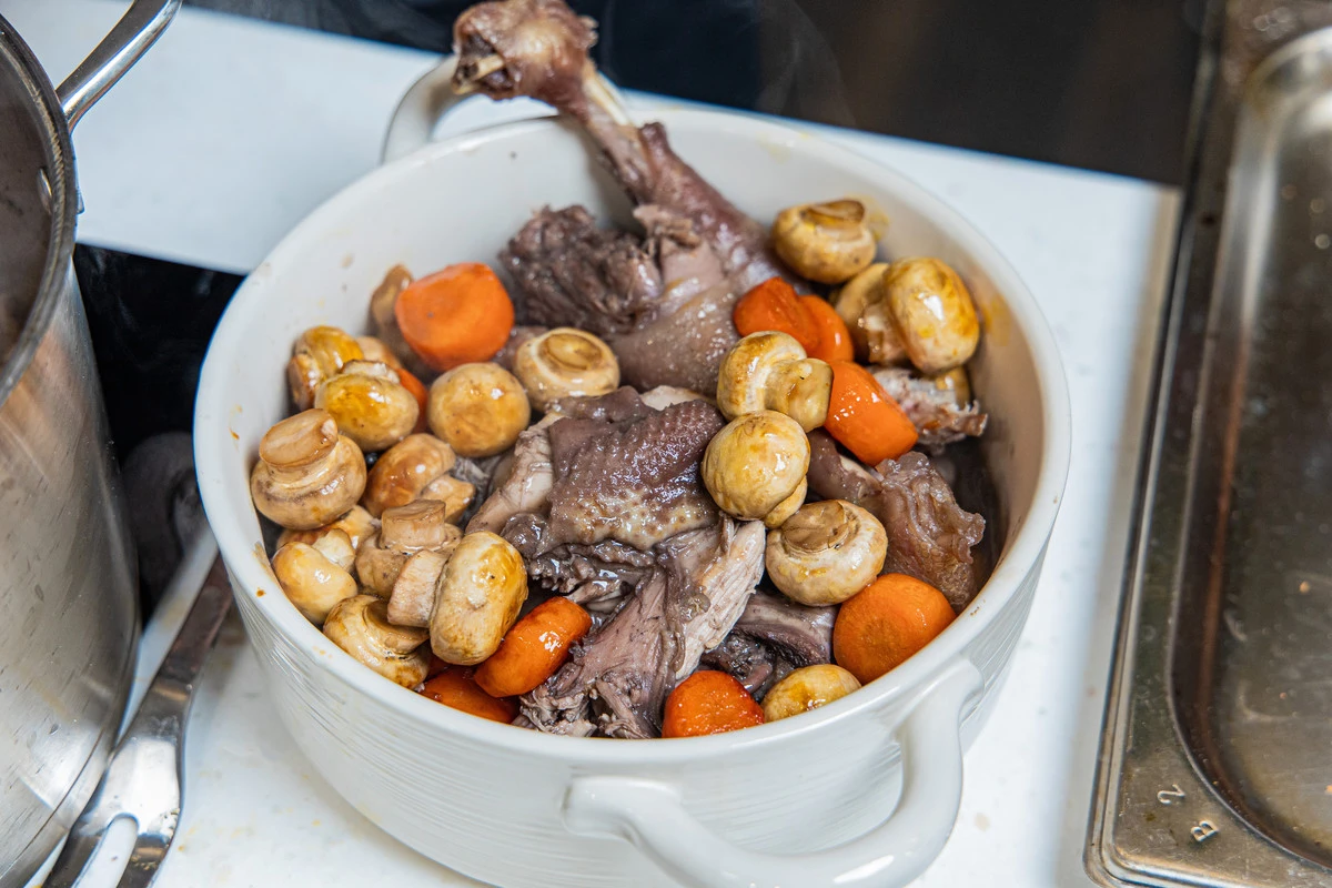 Во Франции в вине традиционно готовят петуха, а мы взяли цесарку. Её мясо тоже достаточно жёсткое и насыщенное, поэтому вкус хорошо раскрывается при длительном приготовлении. Вы можете попробовать приготовить этим же способом суповую курицу, а из обычного цыплёнка-бройлера получится вкусное, но всё же не настолько насыщенное и ароматное блюдо.