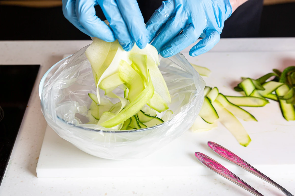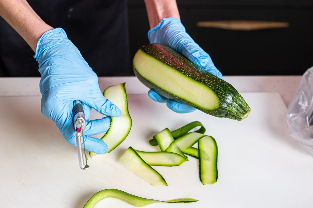 Нарежьте цуккини тонкими полосками с помощью овощечистки.