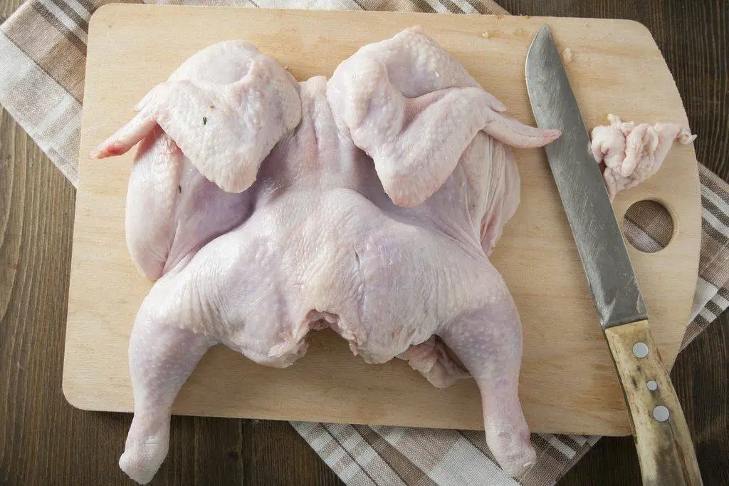 Цыпленка разрежьте вдоль по линии грудной кости и раскройте, как книгу. Удалите гузку и натрите цыпленка солью и перцем с обеих сторон.