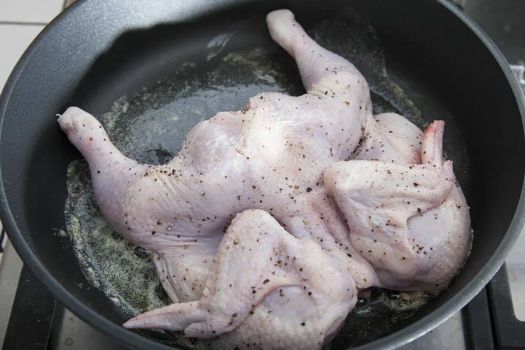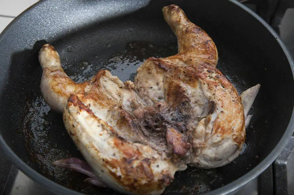 В большой, хорошо разогретой сковороде растопите масло и уложите цыпленка спинкой вверх, придавите (можно использовать специальную тяжелую крышку или просто положить на цыпленка тарелку, а сверху поставить кастрюлю, наполненную водой) и жарьте на сильном огне 7 минут.