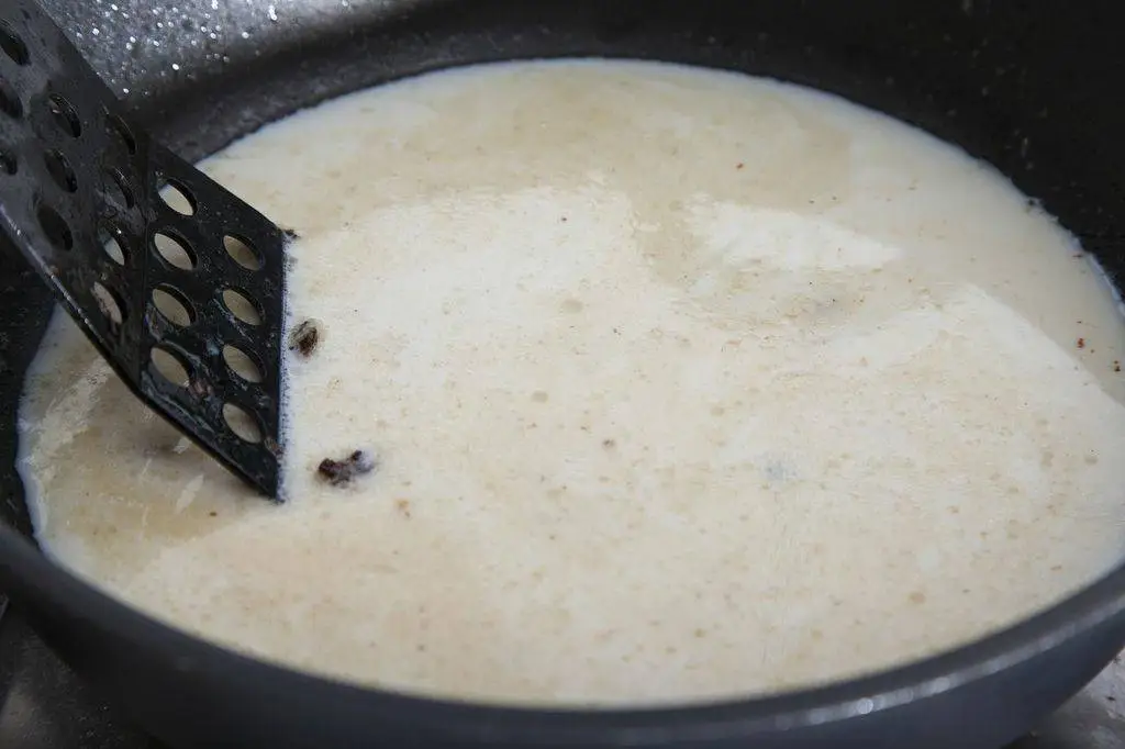 Затем влейте молоко, доведите до кипения, убавьте огонь и подержите 1-2 минуты. Цыпленка залейте соусом и подавайте!