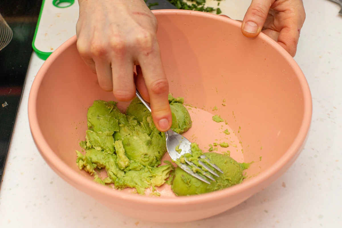 Авокадо очистите от кожуры, мякоть разомните вилкой.