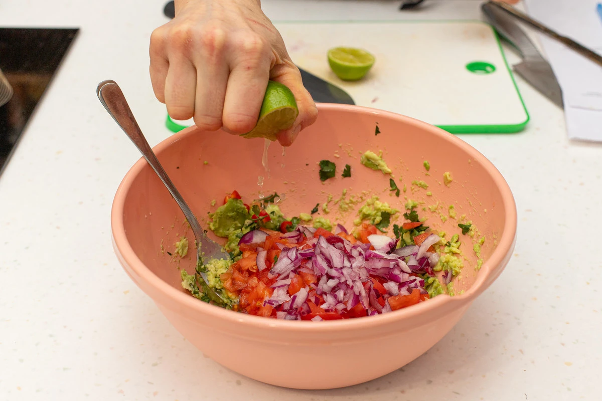 Томат и лук нарежьте мелкими кубиками, кинзу мелко порубите. Соедините всё с авокадо, выжмите сок из лайма, добавьте чуть-чуть оливкового масла. Всё перемешайте, посолите по вкусу.