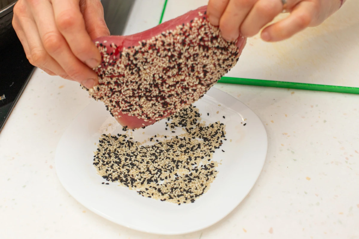 Кунжут насыпьте в плоскую тарелку, обваляйте стейки тунца в кунжуте с одной стороны.