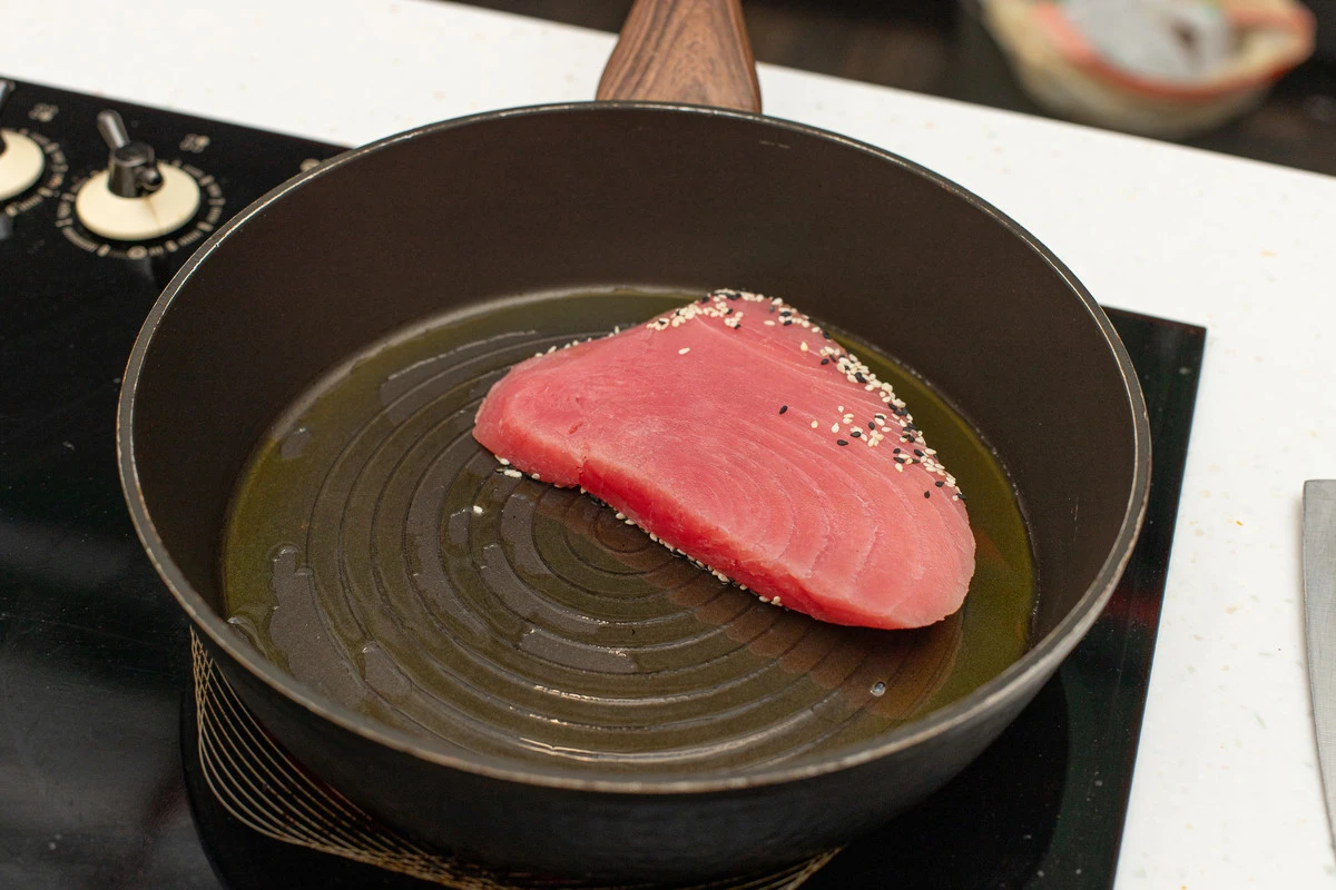 На хорошо разогретой сковороде с оливковым маслом обжарьте стейки тунца с двух сторон по 2-3 минуты.