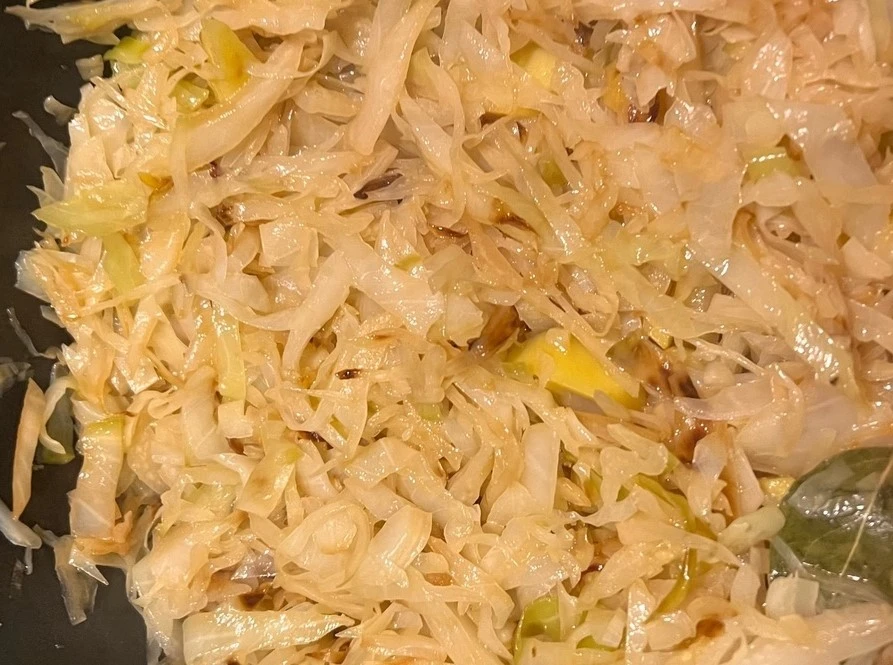 Добавьте к капусте лук и тушите ещё 10 минут.
