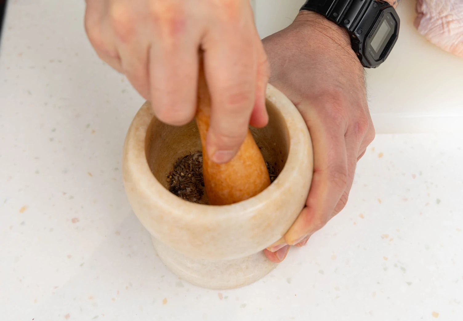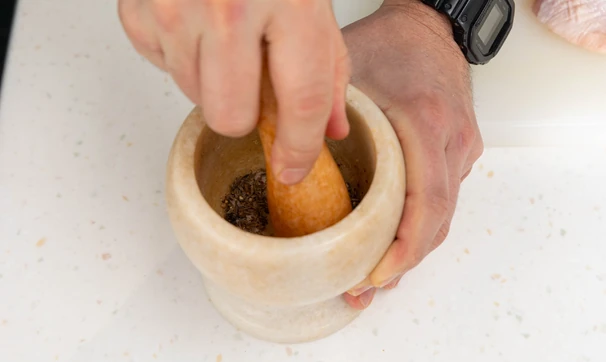 Разрежьте куриные бёдра на небольшие кусочки и натрите их подготовленной смесью специй.