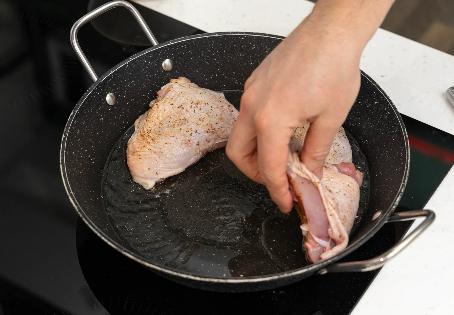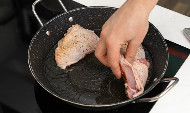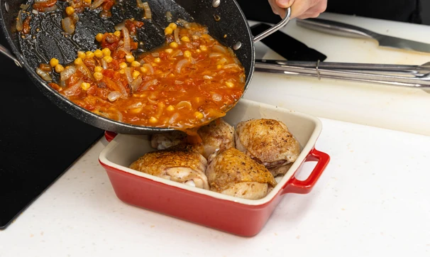 Доведите всё до кипения, верните в сковороду кусочки курицы. Накройте крышкой и поставьте в духовку, разогретую до 180 °С, на 45 минут.