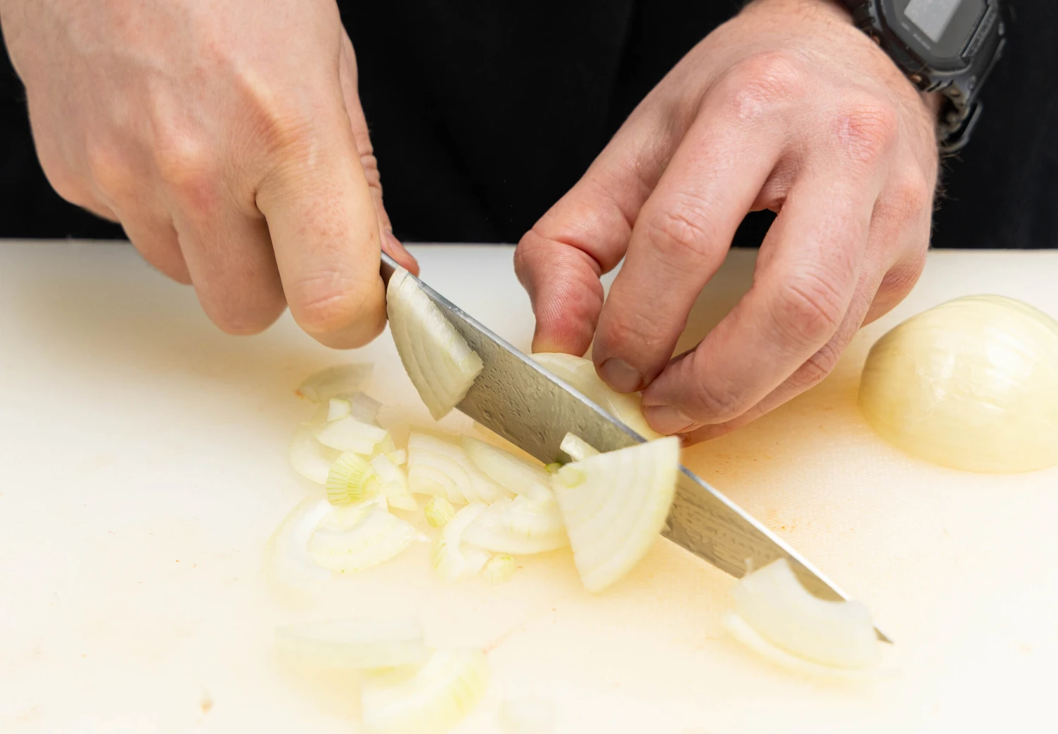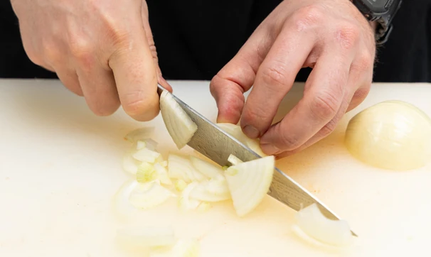 Нарежьте лук полукольцами, а чеснок мелко нарубите. В оставшемся после курицы масле пассеруйте лук около 5 минут, затем добавьте чеснок и щепотку специй и обжаривайте ещё минуту до появления аромата.