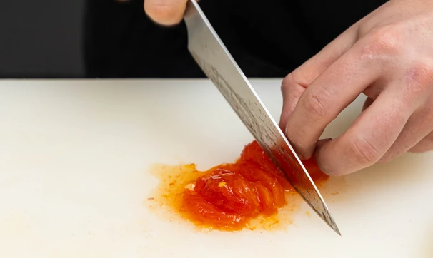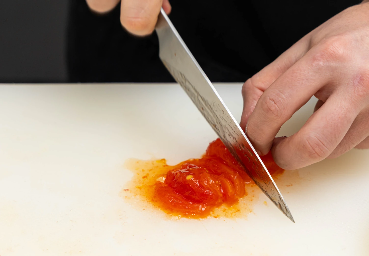 Нарежьте мелким кубиком томаты, оставив отдельно 60 мл сока, а курагу — соломкой.