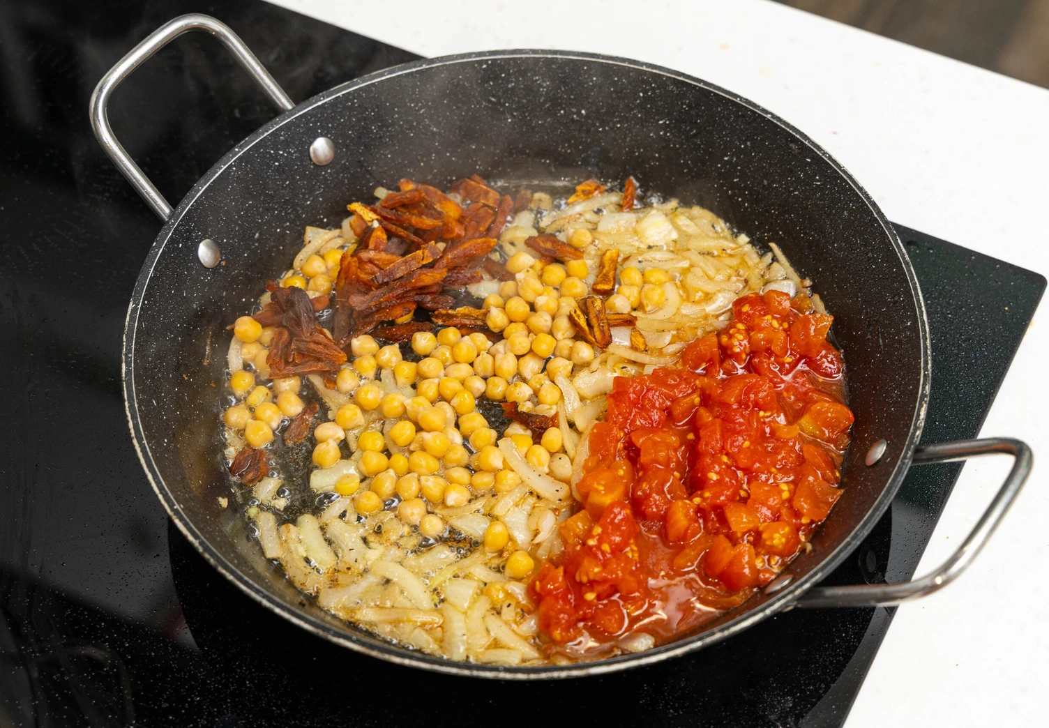 Выложите к луку томатную мякоть, нут, курагу, влейте бульон и томатный сок.