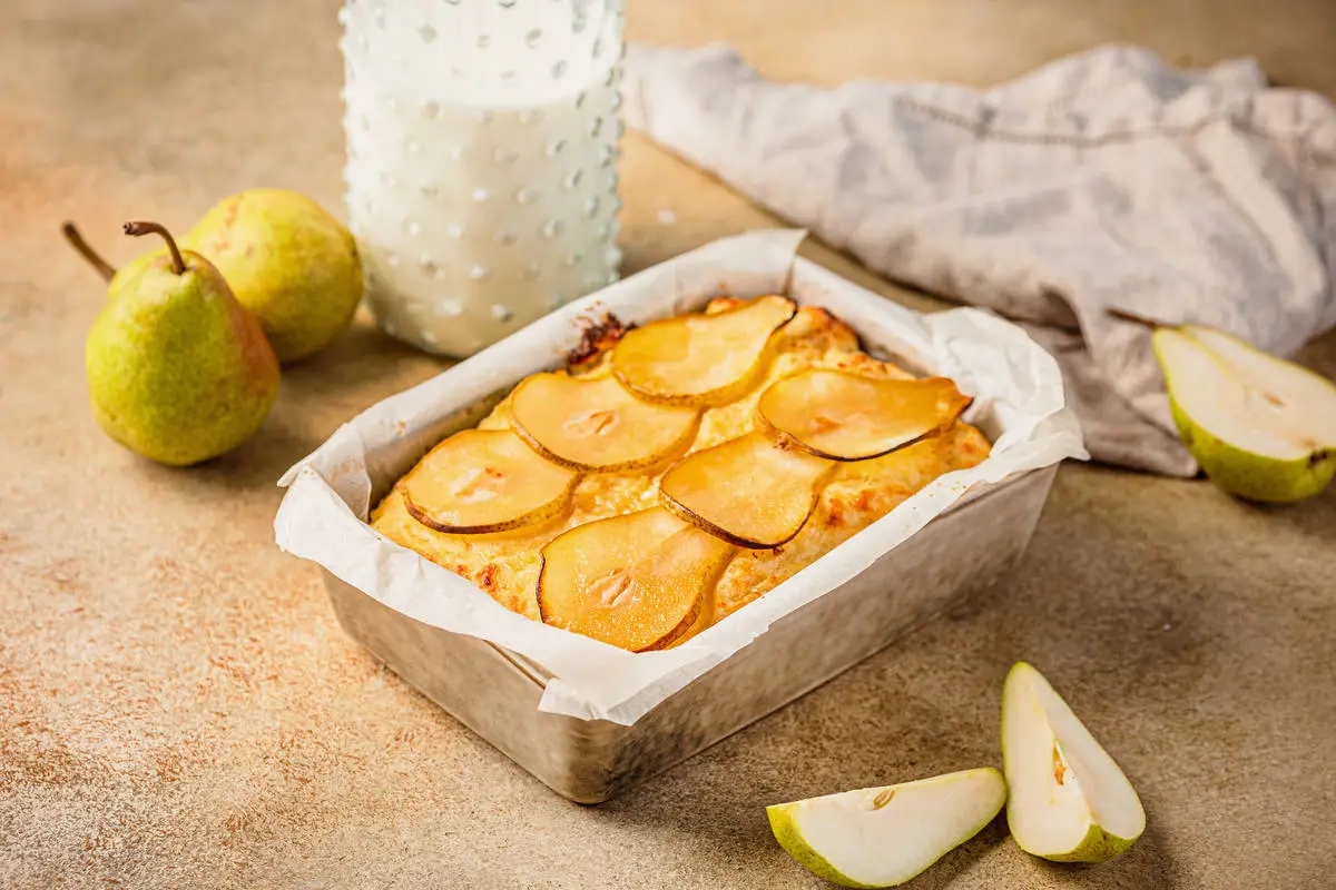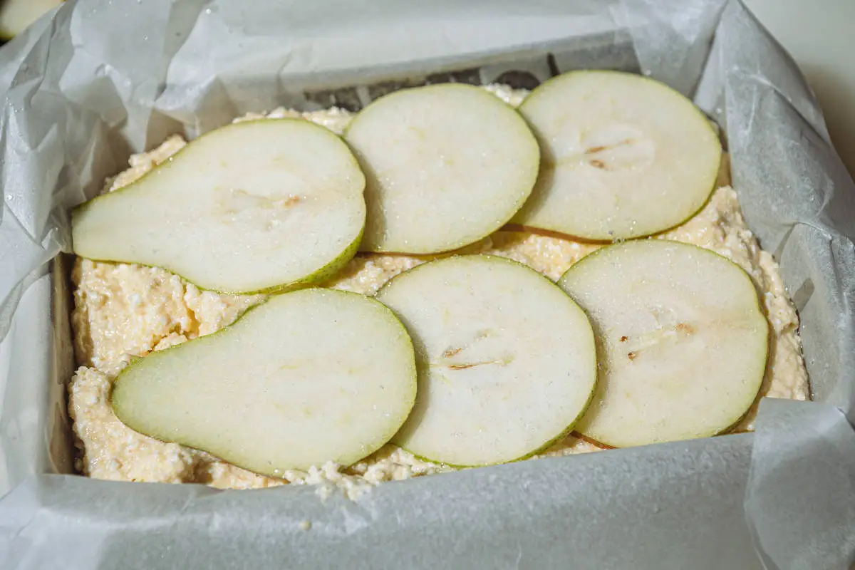 Выложите тесто в форму, смазанную маслом. Грушу нарежьте тонкими ломтиками и слегка вдавите в тесто, выложив поверх.