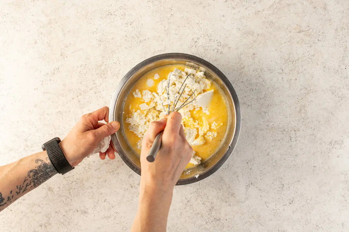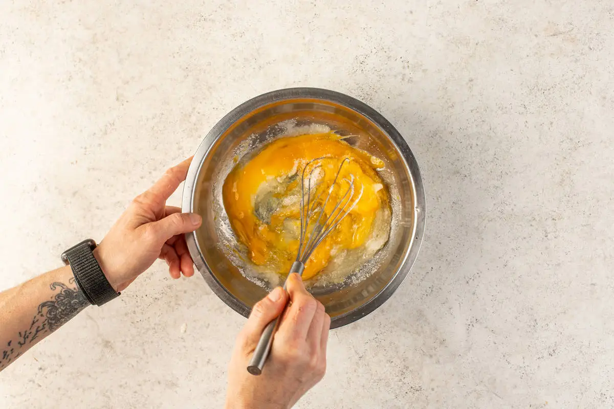 Смешайте сахар с яйцами и взбивайте венчиком до полного растворения сахара.