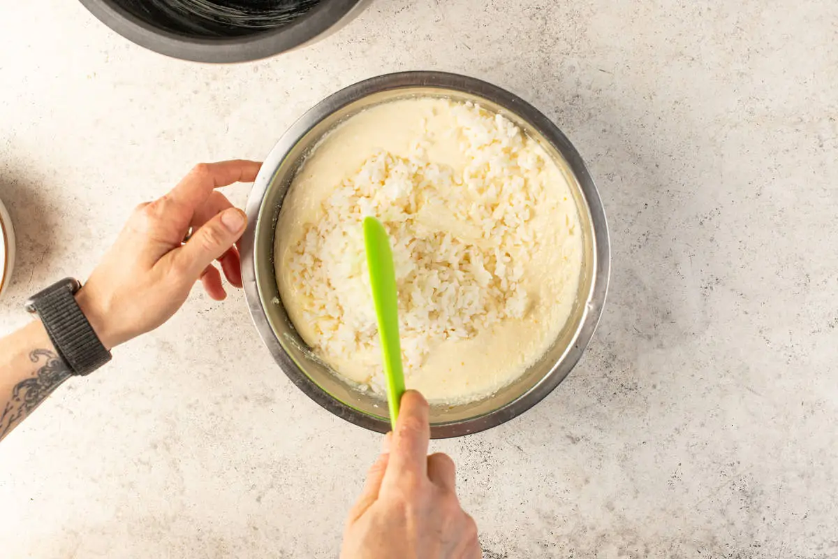 Затем добавьте сметану, творог и рис, хорошо перемешайте.