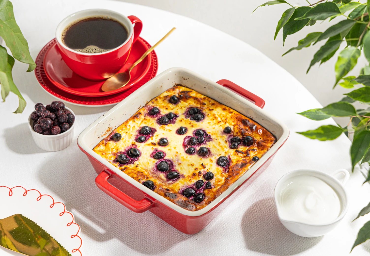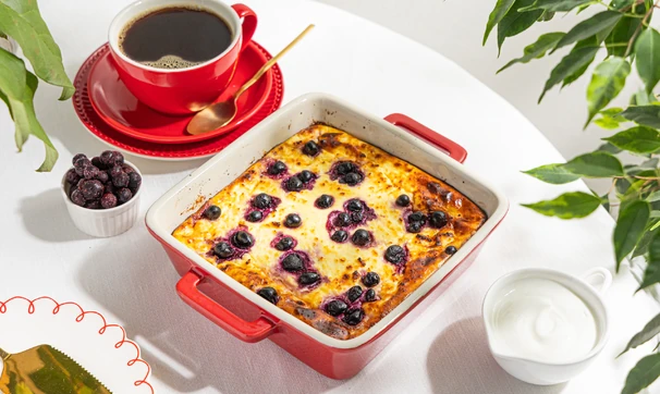 Посыпьте запеканку замороженными ягодами и отправьте на 30–40 минут в духовку, разогретую до 180 °C. Готовой запеканке дайте немного остыть перед подачей.