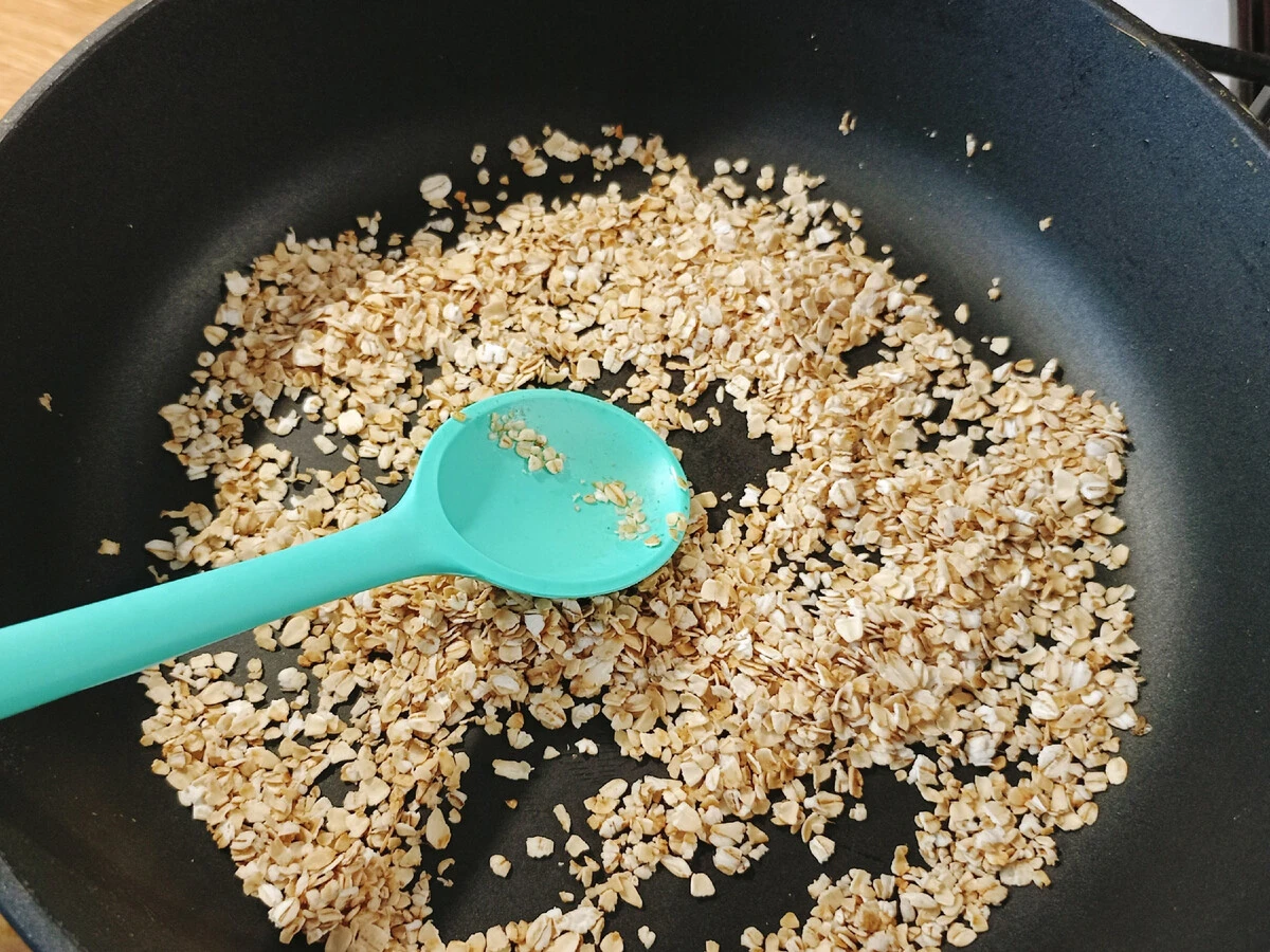 Овсяные хлопья поджарьте на сливочном масле, помешивая в процессе.