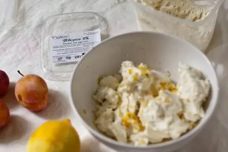 Яйца взбить с сахаром до светлого крема. К творогу добавить немного цедры лимона, перемешать с мукой.